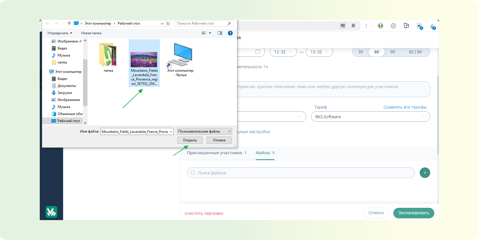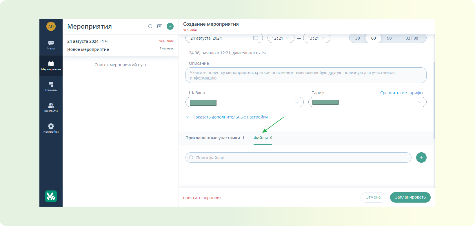 Давайте рассмотрим как добавлять файлы при планировании мероприятия.