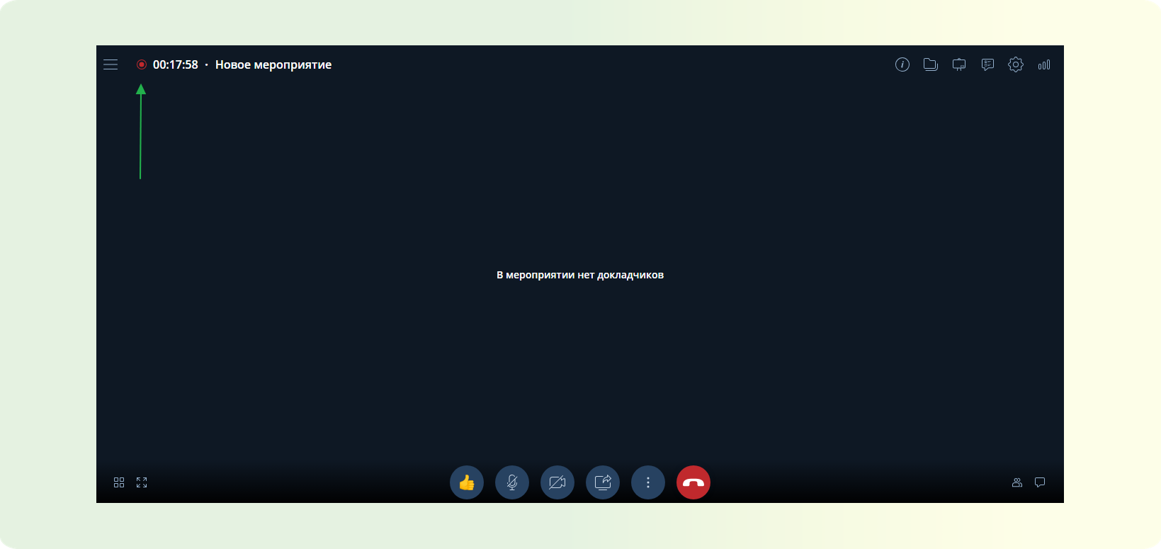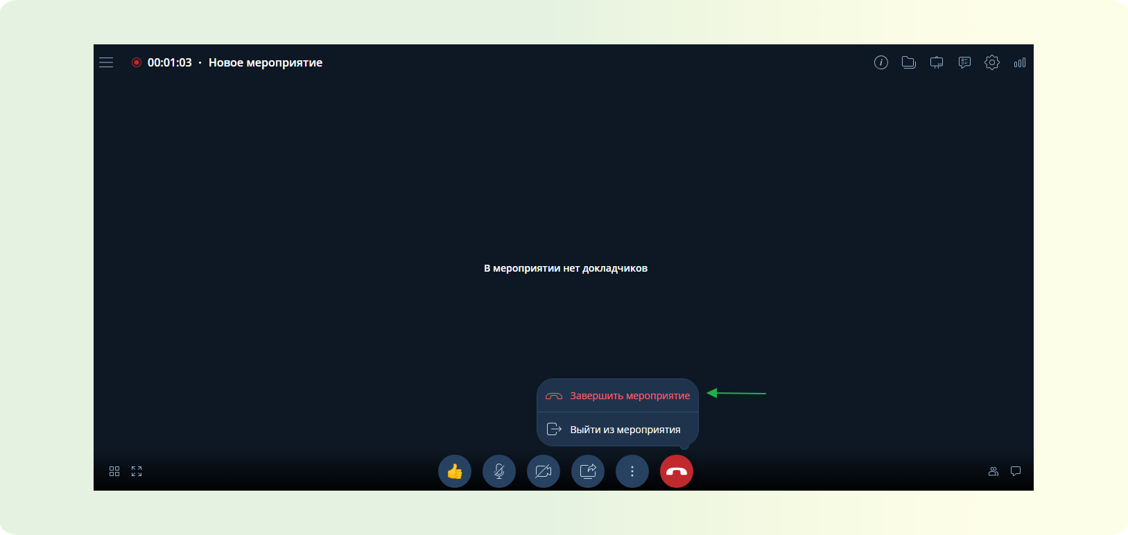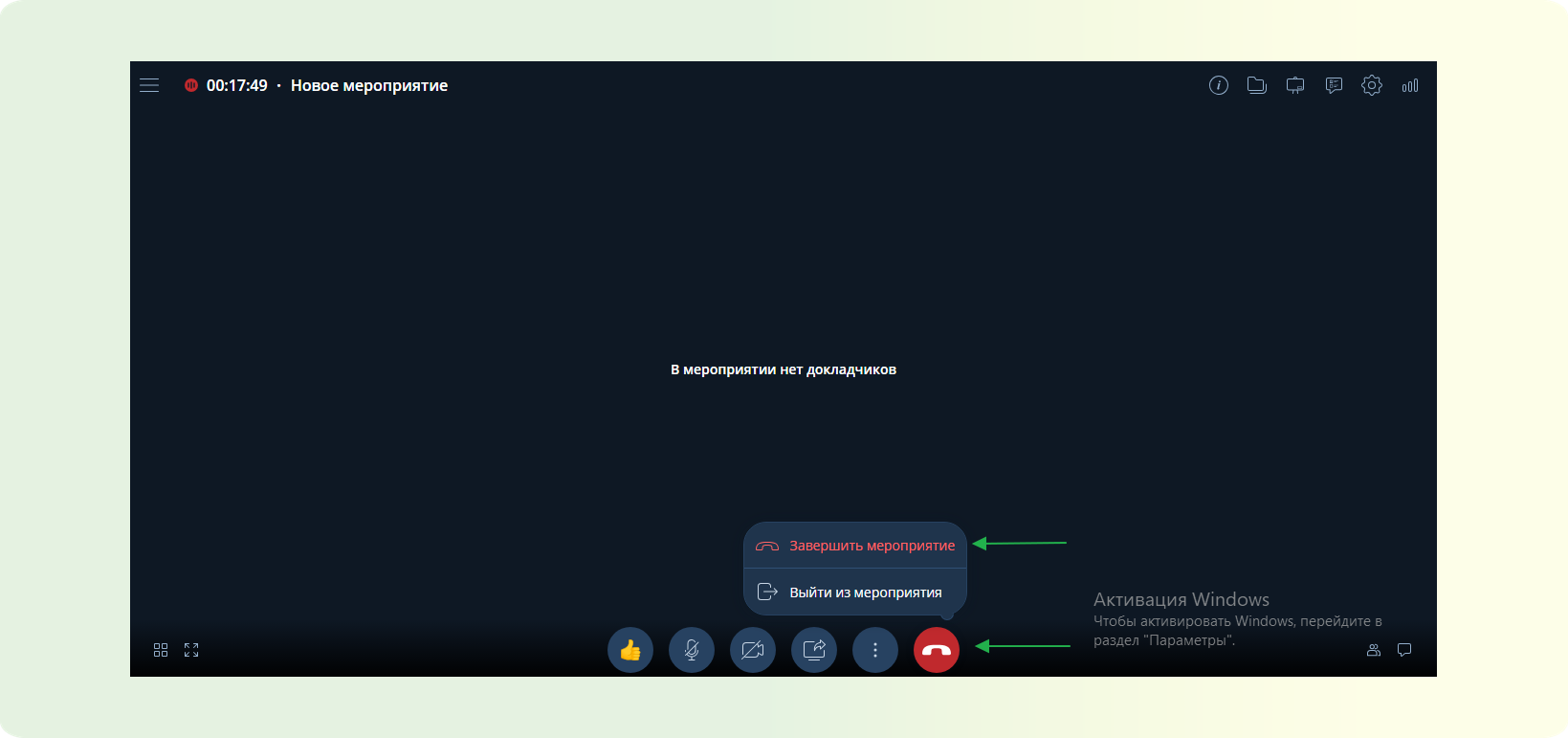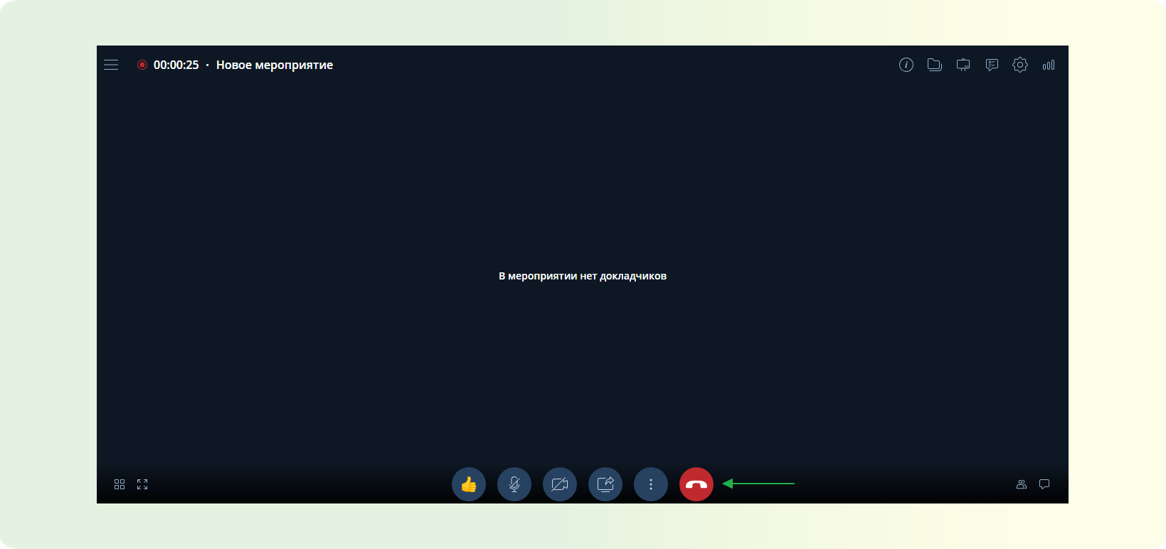 ШАГ 1: На нижней панели управление. Найдите красную кнопку “Выйти из мероприятия”
