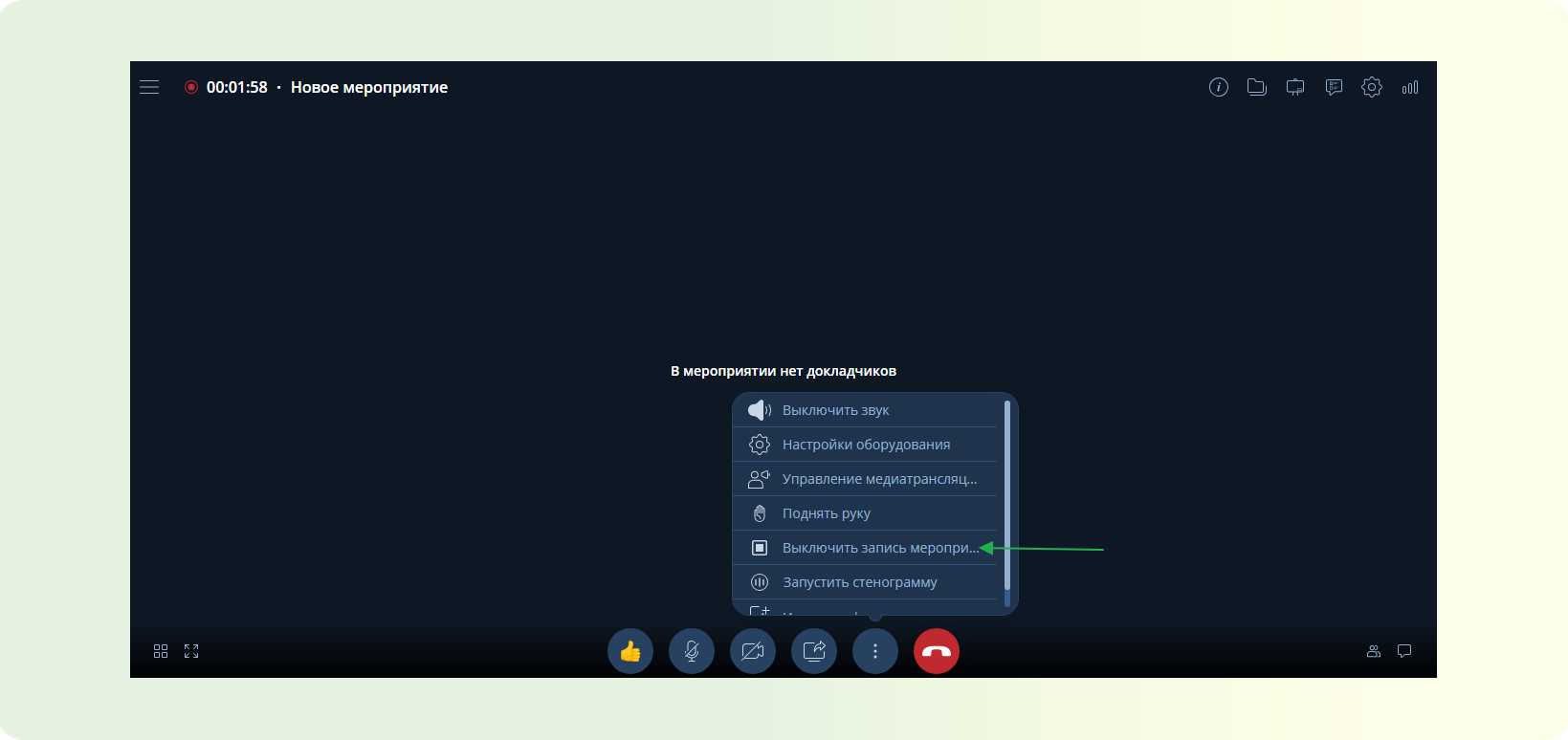 ШАГ 1: На нижней панели управления найдите три вертикальные точки. В появившемся списке кликните по пункту “Выключить запись мероприятия”