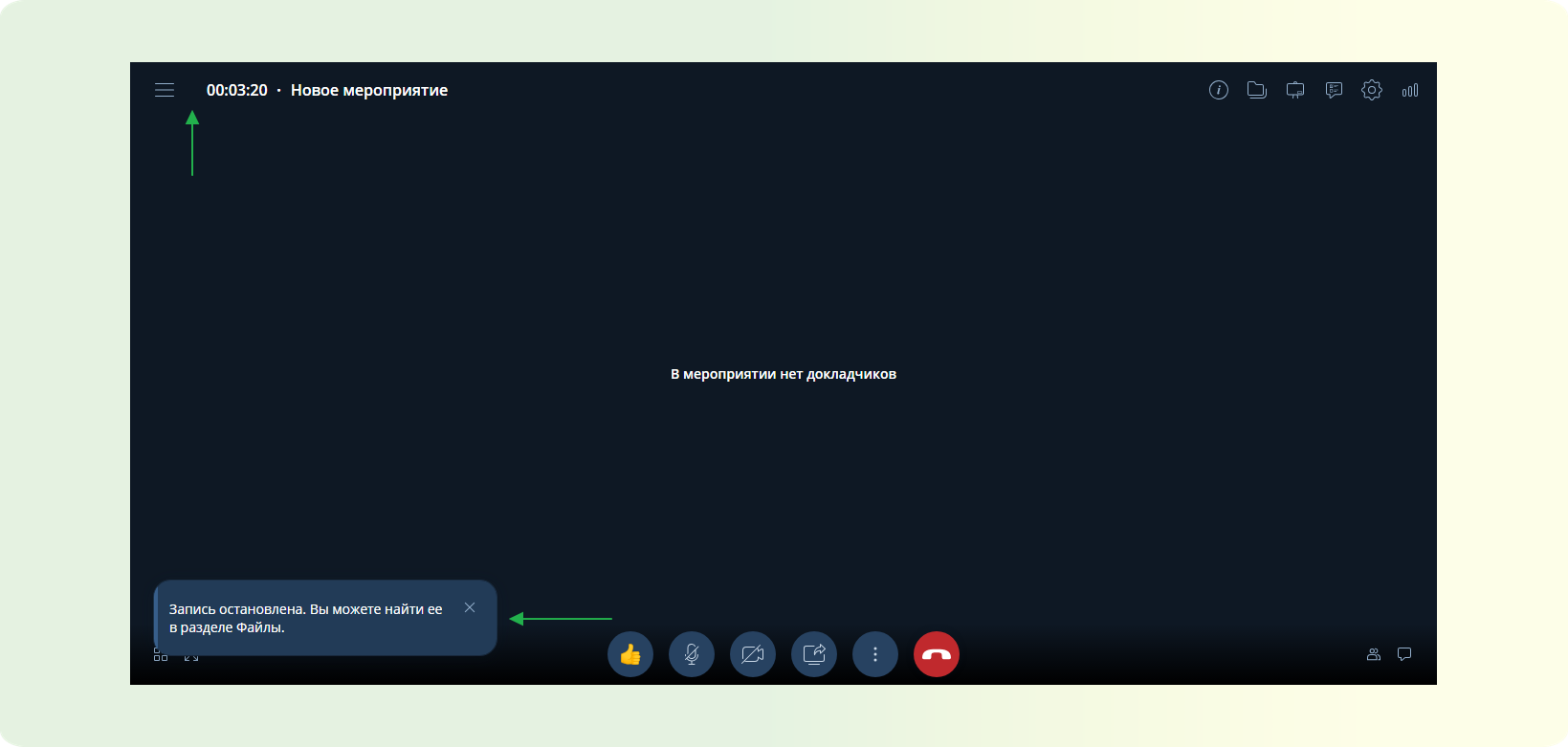 Данный способ работает в любых мероприятиях. Ручное отключение записи мероприятия доступно только для организатора / модератора. Подробнее ознакомиться с доступным функционалом для организатора / модератора можно в этой статье.
