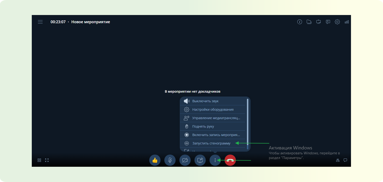 Давайте рассмотрим, как включать стенографирование в мероприятии.