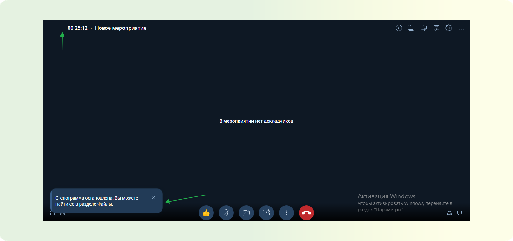 Как выключить стенографирование мероприятия и получить файл.