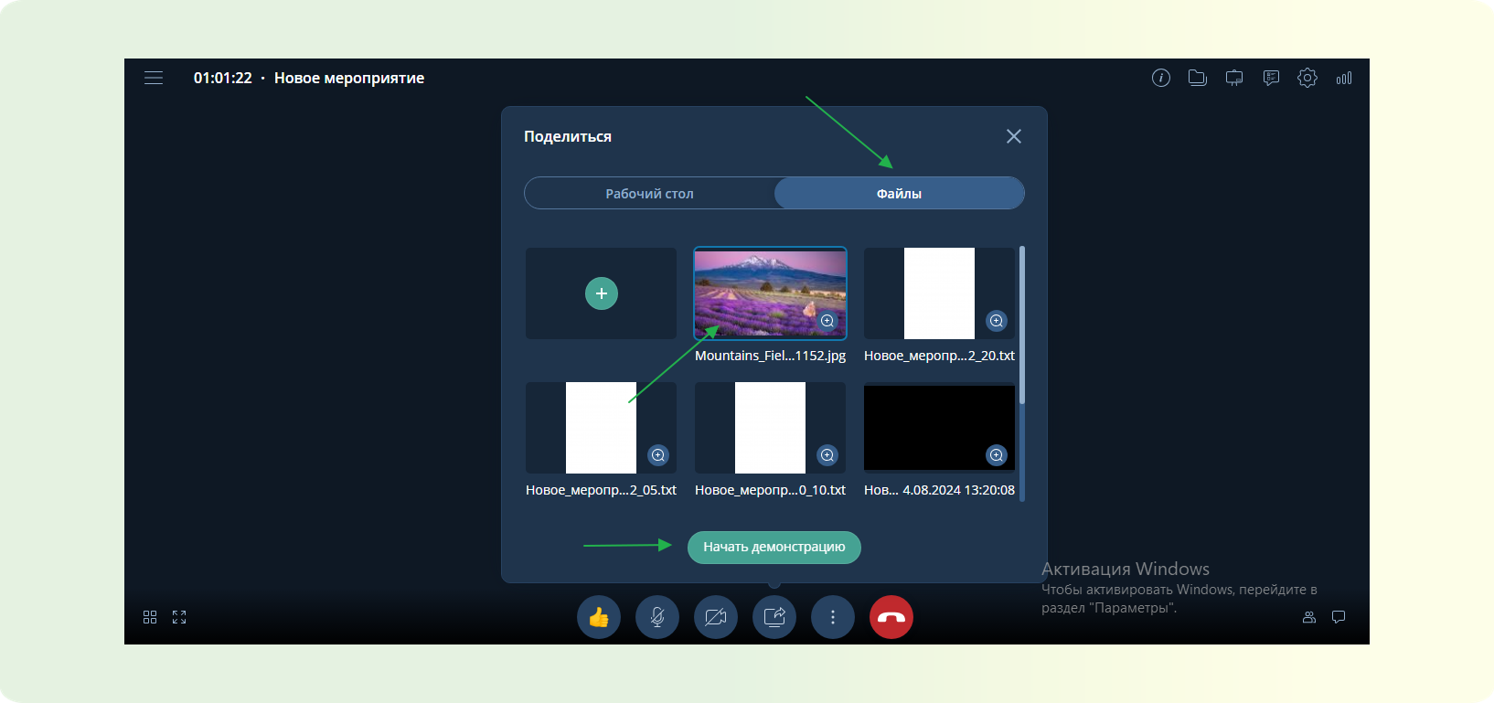 - Нажмите на значок "Демонстрация дополнительного контента" внизу экрана, далее выберите вкладку "Файлы", кликаете на нужный, "Начать демонстрацию".