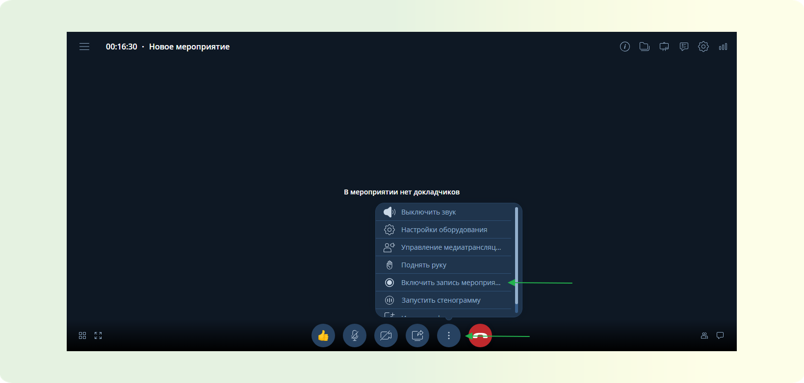 ШАГ 2: На нижней панели управления найдите три вертикальные точки. В появившемся списке выберете кликните по пункту “Включить запись мероприятия”